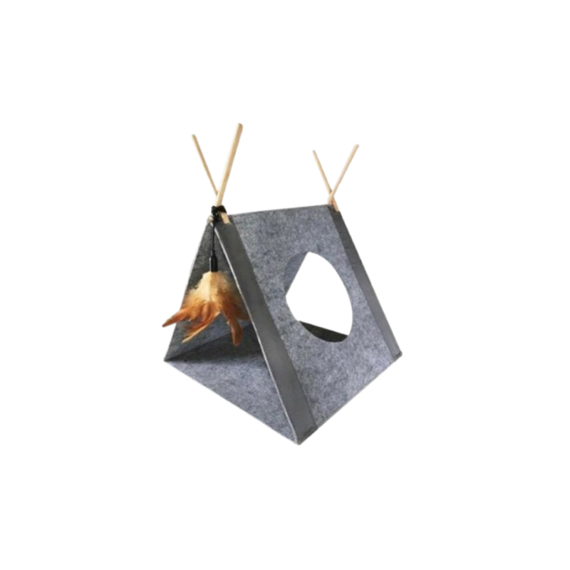 La tienda de campaña PAWISE ofrece a tu gato un espacio tranquilo y seguro para descansar, jugar o esconderse. Con estructura en forma de tipi, está fabricada en fieltro suave de color negro, con varillas de madera y un juguete colgante con plumas para mantener el interés de tu gato.