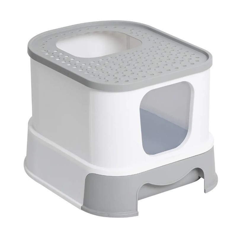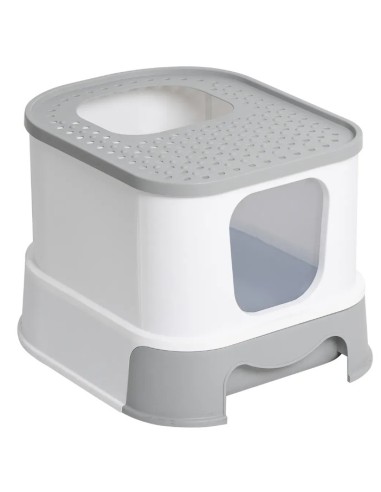 - Caja de arena para gatos con dos entradas: una abertura con puerta en la parte delantera y una abertura sin puerta en la parte superior.