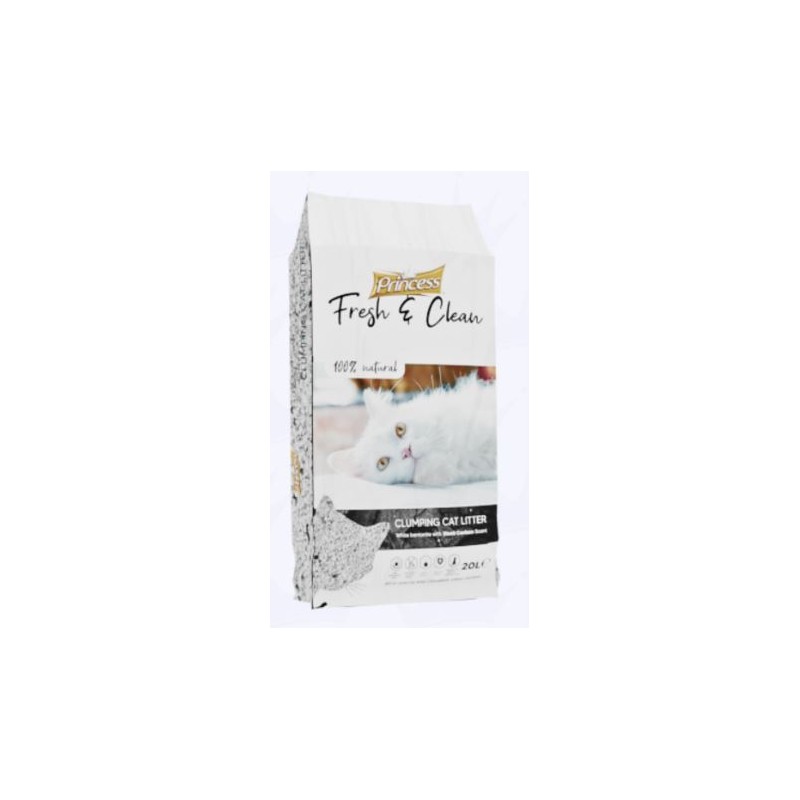 Elija la arena bentonita Princess Fresh & Clean con aroma a carbón negro para una solución natural, práctica y eficaz para las necesidades de arena de su gato.