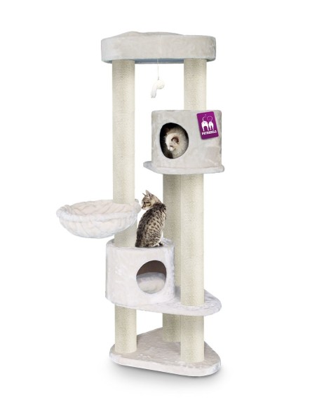 Fabricamos muebles para rascar Charlotte 180 especialmente para gatos grandes y razas de gatos. Necesitan troncos rascadores fuertes y altos para rascarse y estirarse. Porque eso los hace felices. ¡Pero hay más! Una hamaca súper suave, dos lindas casas para dormir y una gran canasta suave para descansar en la parte superior. Así que había espacio para varios gatos. Y debido a la placa inferior extra gruesa, esta decoración es súper estable.