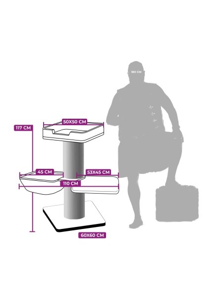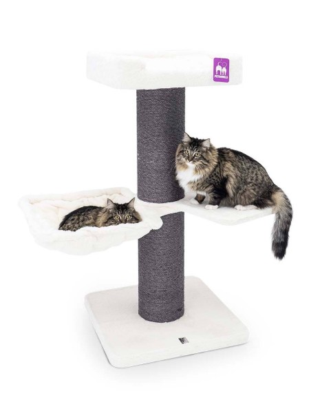 Los gatos Maine Coons, Ragdolls y Norwegian Forest son más grandes y pesados que los gatos calicó "ordinarios". Por lo tanto, estos gatos necesitan un poste de rascado resistente que pueda recibir una paliza. Es por eso que nuestro equipo de diseño creó el Maine Coon 117, un robusto árbol para gatos con una base y una placa base extra gruesas. Y debido a que a esos grandes rebeldes también les gusta un sueño reparador, también hemos proporcionado este elegante mueble para gatos con tres generosos lugares para dormir. Perfecto para una siesta