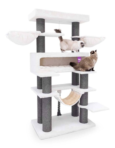 Los gatos aventureros pueden disfrutar de los muebles para gatos Lookout 198. ¡Porque aquí todo es posible! Rascarse en los troncos de cangrejo extra gruesos de 15 centímetros de grosor, gatear sobre el puente de madera y dormir en el mega salón o en una de las dos lujosas hamacas. Y la cesta de salón XL en la parte superior es especialmente para los rebeldes a los que les gusta sentarse o acostarse en lo alto. Genial para roncar, pero por supuesto también para ver si se puede confiar en los visitantes.