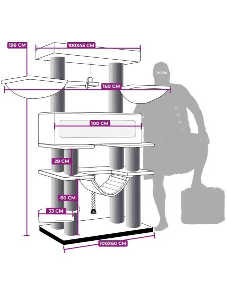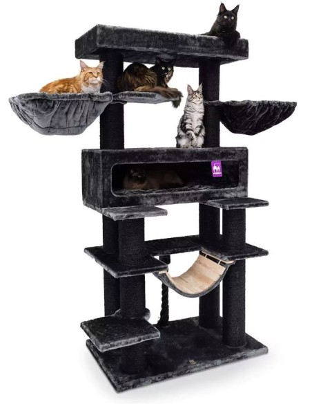 Los gatos aventureros pueden disfrutar de los muebles para gatos Lookout 198. ¡Porque aquí todo es posible! Rascarse en los troncos de cangrejo extra gruesos de 15 centímetros de grosor, gatear sobre el puente de madera y dormir en el mega salón o en una de las dos lujosas hamacas. Y la cesta de salón XL en la parte superior es especialmente para los rebeldes a los que les gusta sentarse o acostarse en lo alto. Genial para roncar, pero por supuesto también para ver si se puede confiar en los visitantes.