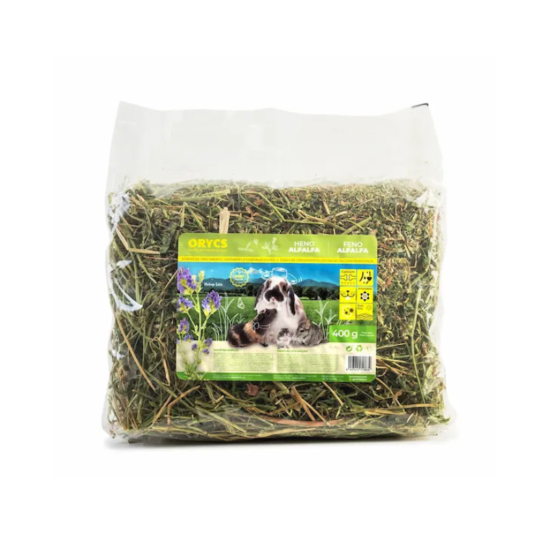 La alfalfa 100% natural es una excelente fuente de nutrientes para conejos y pequeños roedores, especialmente en fases de crecimiento, gestación, lactancia o convalecencia. Cultivada en campos seleccionados y secada al sol de forma natural, esta alfalfa destaca por su alto contenido en calcio y su gran aporte de proteínas, fibra y vitaminas esenciales.