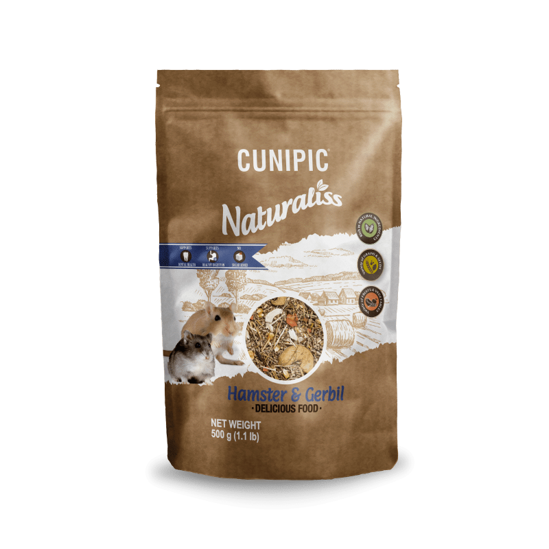 Hámster & Jerbo 500g de Naturaliss, es un alimento completo para hámster y jerbos de cualquier edad, que contiene todos los nutrientes necesarios para que crezcan sanos, fuertes y felices. Es un producto 100 % natural, sin colorantes añadidos y con una alta palatabilidad gracias a la diversidad de plantas y aromas que contiene en cada bolsa. Además, contiene un alto porcentaje en proteína y fibra para favorecer el crecimiento del pequeño roedor y ayudar a prevenir problemas gastrointestinales. Naturaliss Hámster y Jerbo está compuesto por una mezcla de hojas, semillas y frutas deshidratadas, que proporcionan una dieta natural, nutritiva y sabrosa para tu preciada mascota.