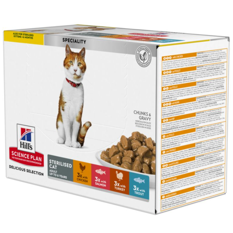 Este multipack incluye deliciosos trocitos en salsa con pollo, trucha, pavo o salmón, elaborados con ingredientes de alta calidad y fáciles de digerir. Cada receta incorpora L-carnitina clínicamente probada, que ayuda a tu gato a mantenerse en forma y activo, y un perfil mineral ajustado para favorecer la salud del sistema urinario. Su bajo contenido en grasa y el aporte adicional de L-lisina contribuyen al mantenimiento de la vitalidad en los gatos adultos esterilizados.