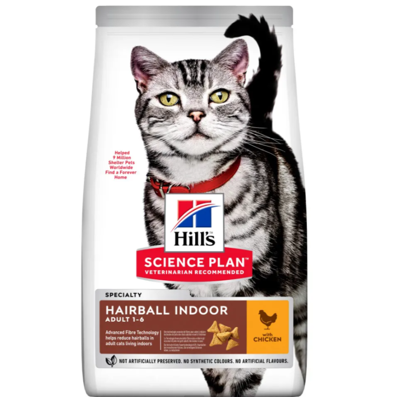 Hill's Science Plan Hairball Indoor con pollo es un alimento completo especialmente formulado para gatos adultos de interior, de 1 a 6 años de edad, que ayuda a reducir eficazmente la formación de bolas de pelo. Gracias a su tecnología avanzada de fibras y su bajo contenido en grasa y calorías, favorece un peso saludable, una buena digestión y un entorno más limpio en casa.