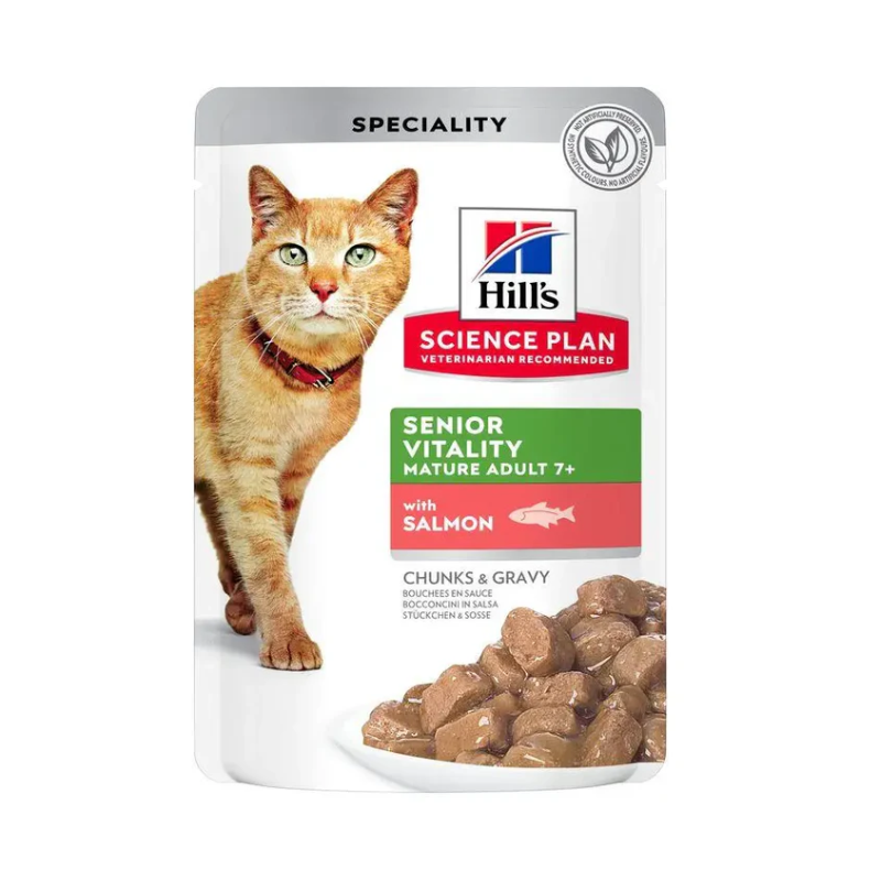 Hill’s Science Plan™ Youthful Vitality con Salmón en Salsa es un alimento completo especialmente formulado para gatos mayores de 7 años.