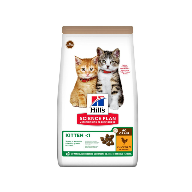 Hill’s Science Plan No Grain Gatitos Pollo es un alimento completo formulado específicamente para gatitos desde las 3 semanas hasta los 12 meses de edad, así como para gatas en gestación y lactación. Su receta sin cereales ni gluten, con pollo como ingrediente principal y DHA procedente de pescado, proporciona una nutrición avanzada que favorece el desarrollo cerebral, la visión y la inmunidad, ayudando a tu gatito a crecer sano y fuerte.