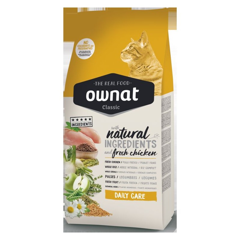 Alimento completo y equilibrado para gatos adultos de cualquier raza, ideal para una nutrición diaria saludable y natural. La receta OWNAT Classic Daily Care incorpora carne fresca, cereales integrales y frutas y verduras deshidratadas, proporcionando una excelente digestibilidad, sabor y todos los nutrientes esenciales para el bienestar diario de tu gato.