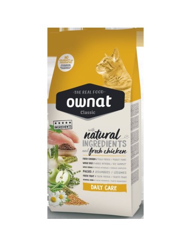 Alimento completo y equilibrado para gatos adultos de cualquier raza, ideal para una nutrición diaria saludable y natural. La receta OWNAT Classic Daily Care incorpora carne fresca, cereales integrales y frutas y verduras deshidratadas, proporcionando una excelente digestibilidad, sabor y todos los nutrientes esenciales para el bienestar diario de tu gato.
