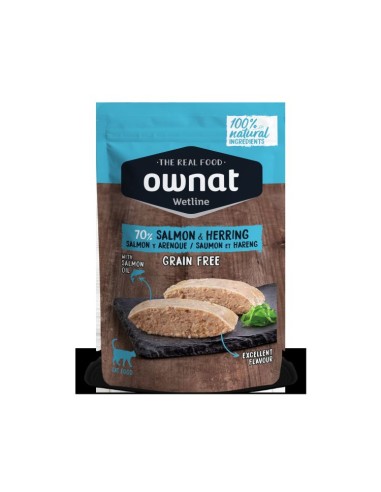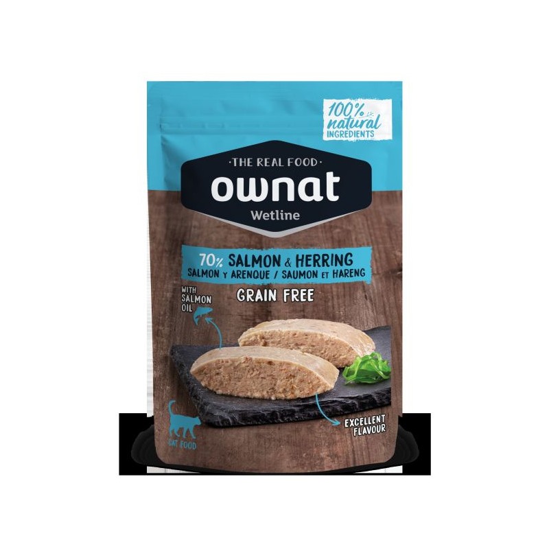 Bocados de pollo y salmón en salsa. Alimento húmedo natural para kitten.