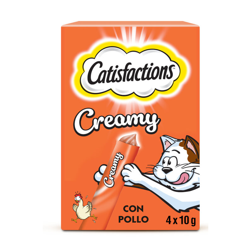 Catisfactions snack para gatos, con formato cremoso y sabor a pollo.