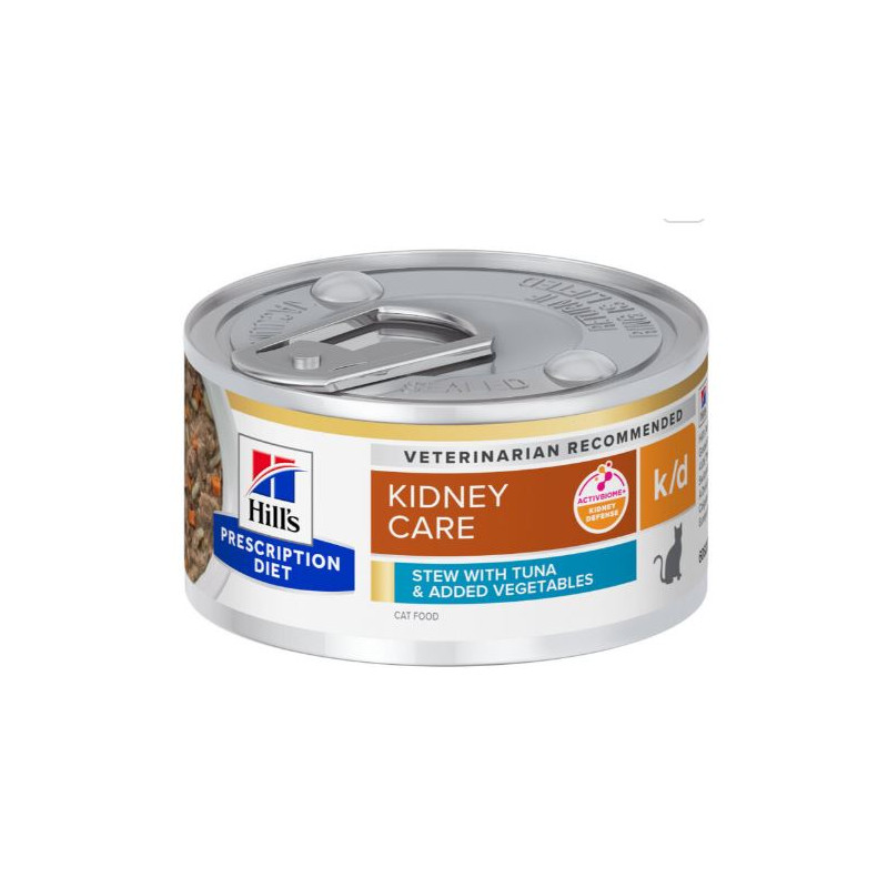 El estofado de Hill's Prescription Diet k/d se puede encontrar en diferentes variedades, que pueden variar según el minorista:- Estofado con atún y verduras: Disponible en lata de 82 g en tiendas como Kiwoko y Tiendanimal.