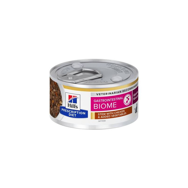 Hill's Prescription Diet Gastrointestinal Biome en lata de 82 g para gatos adultos.Ingredientes claveLos ingredientes de esta fórmula están seleccionados para ser altamente digestibles y nutrir el microbioma intestinal del gato.
