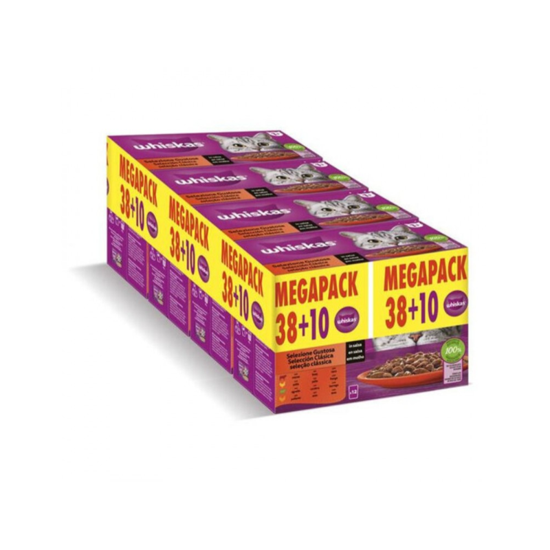 Haz que cada comida sea una fiesta de sabor con Whiskas Selección en Salsa. Este pack de comida húmeda para gatos adultos ofrece una deliciosa variedad de recetas con ingredientes sabrosos como pollo con guisantes, buey, cordero con zanahorias y pavo, pensadas para mantener el interés y el apetito de tu felino día tras día.