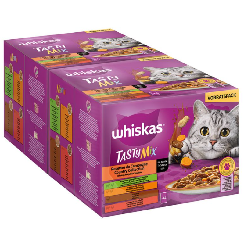 Whiskas Tasty Mix está formulado para cubrir el 100 % de las necesidades nutricionales de los gatos adultos, con ingredientes cuidadosamente seleccionados, enriquecidos con vitaminas, minerales y taurina, un nutriente esencial que contribuye a una visión saludable y una vida vital.