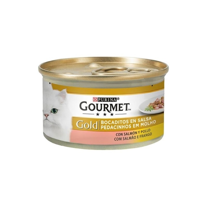 PURINA® GOURMET® Gold Bocaditos en Salsa 85g. Con Salmón y Pollo. Tiernos trocitos de carne y pescado en deliciosa salsa.