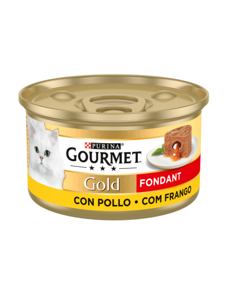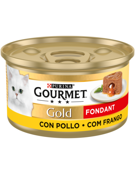 Comida para gatos Gourmet Gold Fondant es una gama de suaves e irresistibles mousses con buey, pollo, salmón y otros exquisitos sabores, con un sorprendente corazón líquido en el interior para hacer su alimentación para gatos incluso más especial. Tu gato primero morderá la suave y delicada mousse para después descubrir un inesperado corazón de suculenta salsa que le encantará.