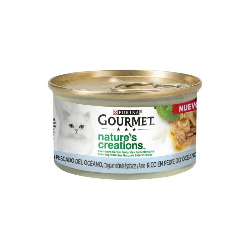 Gourmet Natures Creations es una gama de recetas deliciosas inspiradas en la naturaleza. Estas recetas están atentamente preparadas con ingredientes naturales selecionados de alta calida, cocinadas cuidadosamente y ricas en buey, cordero, ave o pescado con guarnición de verduras como espinacas, zanahorias o tomate o arroz. Cada gustosa receta está preparada para que tu gato exigente disfrute y saboree cada bocado.