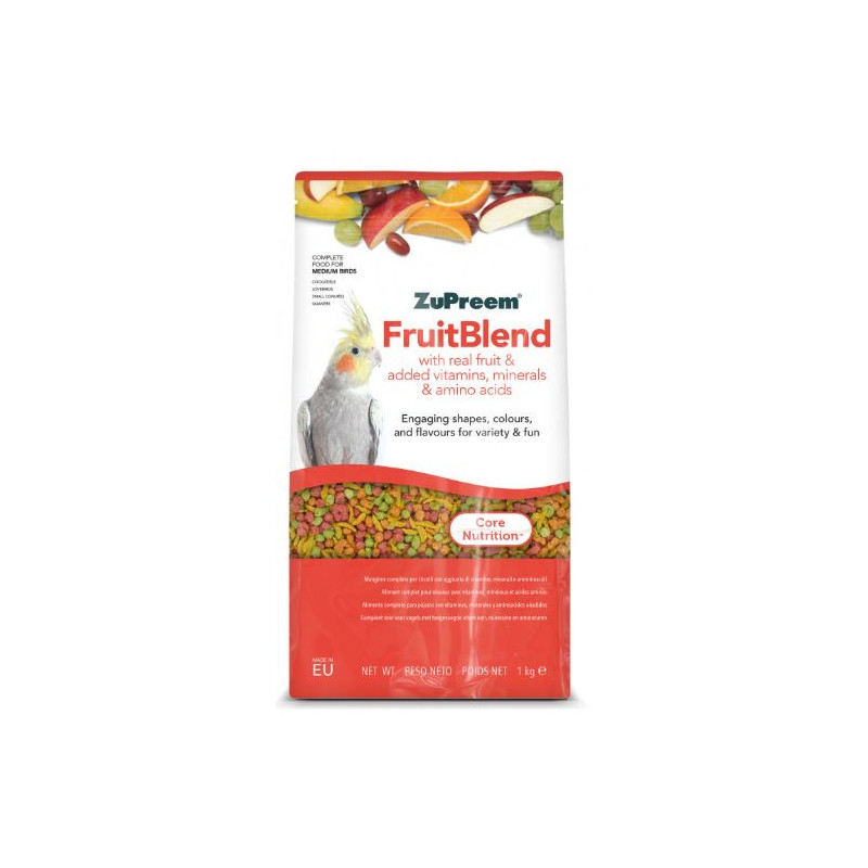 Alimento completo para pájaros. FruitBlend con frutas reales es un alimento diario completo para aves de compañía que proporciona cada día una nutrición saludable y deliciosa a pájaros de tamaño medio, incluidos cacatúas ninfa, agapornis, cotorras pequeñas, cotorras argentinas y otros pájaros de tamaño medio que prefieren gránulos de este tamaño