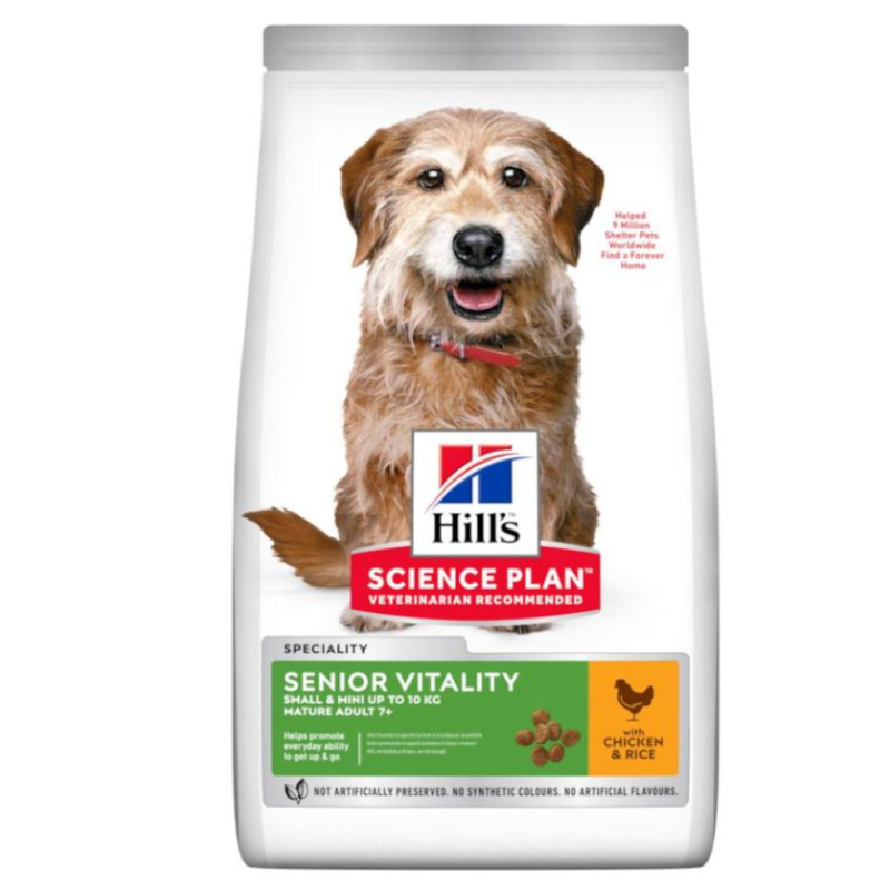 Hill's Science Plan Senior Vitality Small & Mini con Pollo y Arroz es un alimento completo y equilibrado diseñado específicamente para perros mayores de razas pequeñas y mini (hasta 10 kg) a partir de los 7 años de edad. Esta fórmula avanzada ayuda a mantener la energía diaria, la función cerebral y la vitalidad general en la etapa sénior.