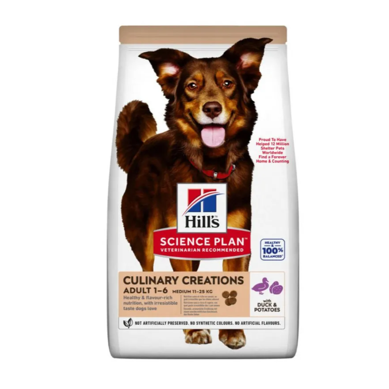 Hill’s Science Plan Culinary Creations con pato y patata ha sido formulado para ofrecer una experiencia de sabor superior, sin renunciar a una nutrición equilibrada que favorezca la salud y el bienestar de tu perro durante su etapa adulta.