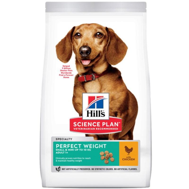 Hill's Science Plan Perfect Weight Small & Mini Adult con pollo es un alimento completo especialmente formulado para perros adultos de razas pequeñas y mini con tendencia a ganar peso o con un ligero sobrepeso. Su fórmula clínicamente probada permite lograr una pérdida de peso segura y eficaz, con resultados visibles, a la vez que mantiene el peso ideal a largo plazo.