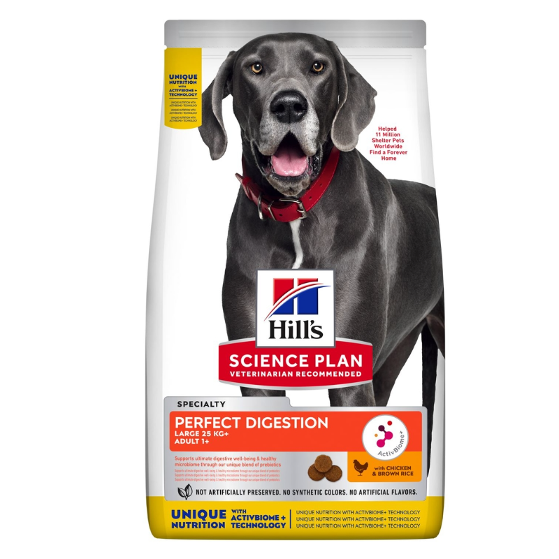 Hill’s Science Plan Perfect Digestion con Pollo y Arroz Integral es un alimento completo formulado para perros adultos de razas grandes y gigantes (más de 25 kg) de entre 1 y 5 años de edad. Gracias a su avanzada tecnología nutricional, ayuda a mantener una digestión equilibrada y favorece un microbioma intestinal saludable.