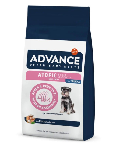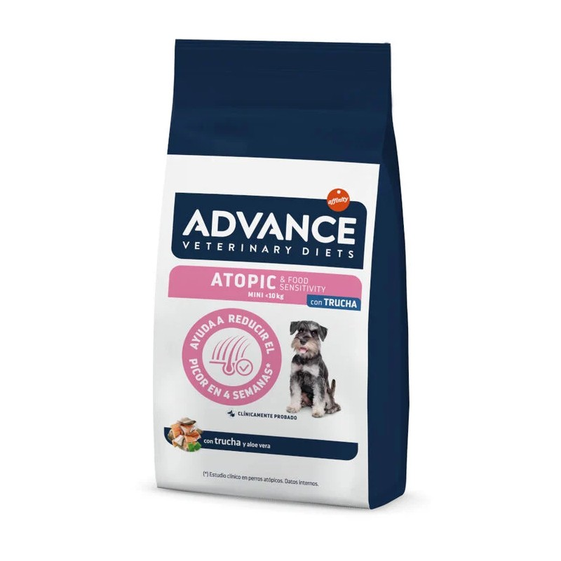 Advance Veterinary Diets Atopic Mini es un alimento dietético completo diseñado para perros adultos y cachorros mayores de 4 meses de razas pequeñas (<10 kg), que sufren dermatitis, pérdida excesiva de pelo o intolerancias alimentarias. Su fórmula ha sido clínicamente probada y está desarrollada para restaurar la barrera cutánea, reducir el picor y mejorar visiblemente el estado de la piel.