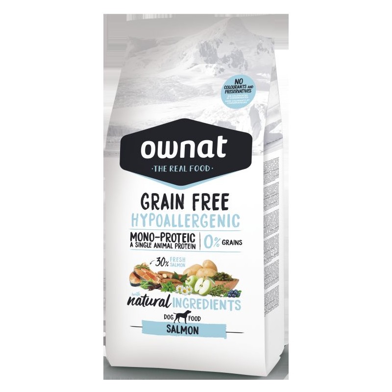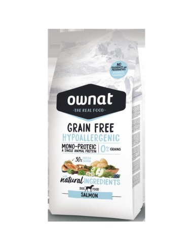 Ownat Grain Free Hipoalergénico Salmón está formulado sin cereales y con ingredientes de alta calidad, especialmente pensado para perros con intolerancias alimentarias, alergias o digestiones delicadas. Su fuente única de proteína animal (salmón fresco) facilita la digestión y reduce el riesgo de reacciones adversas. Aporta ácidos grasos esenciales omega-3 que favorecen una piel sana y un pelaje brillante, además de contribuir al refuerzo del sistema inmunitario.