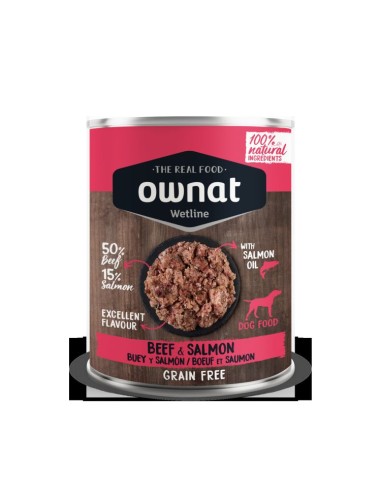 Alimento húmedo completo para perros adultos, con una receta elaborada a base de carne fresca de buey y salmón