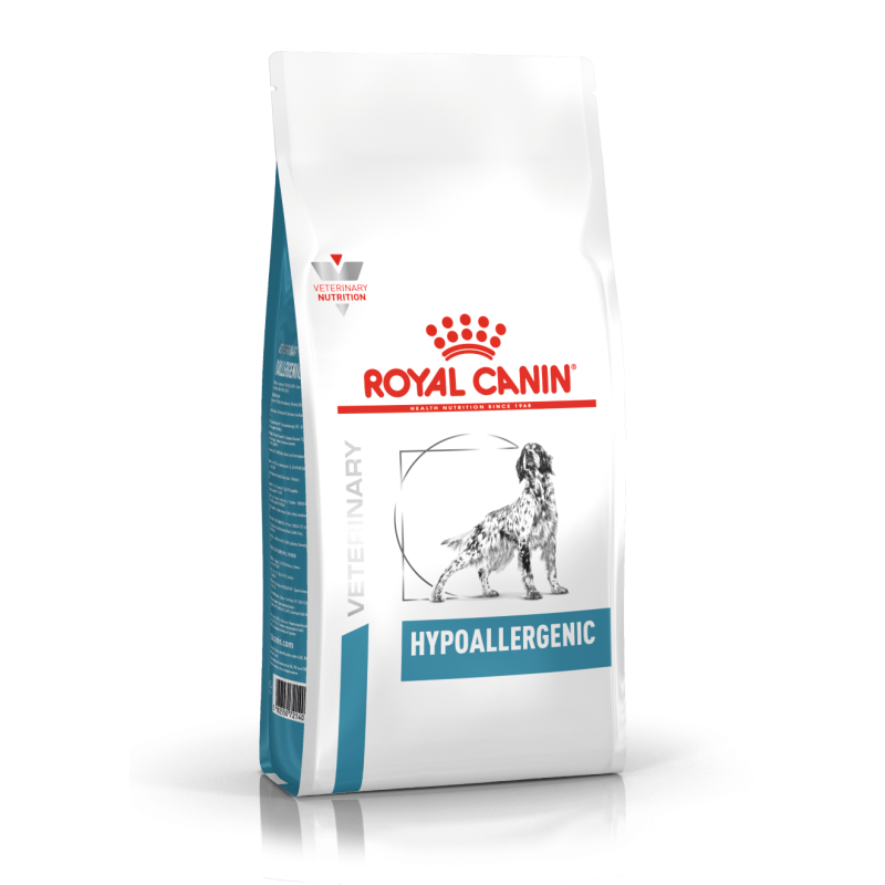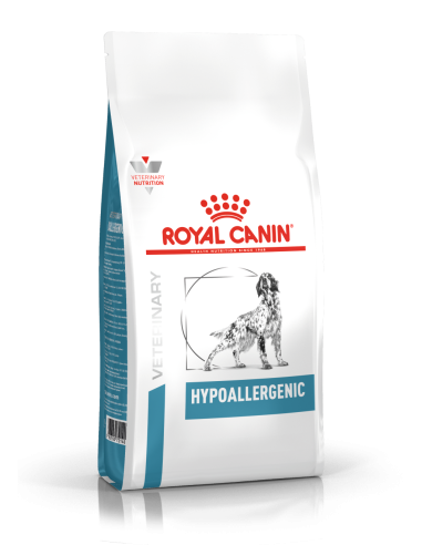 Royal Canin Hypoallergenic es un pienso medicado para perros que sufren trastornos alérgicos digestivos o dérmicos. Es un alimento indicado para animales que necesitan una dieta de eliminación o padecen intolerancias alimentarias con signos dermatológicos y/o gastrointestinales, diarreas crónicas y sobrecrecimiento bacteriano. También se recomienda para tratar la IBD (enfermedad inflamatoria intestinal) y la IPE (insuficiencia pancreática exocrina).