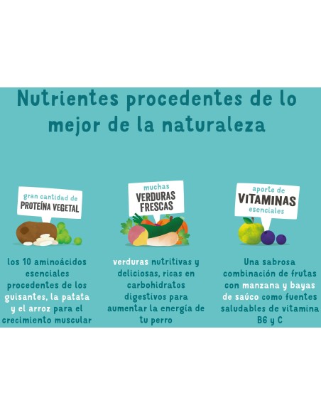 Esta completa receta de origen vegetal es deliciosa y le da a tu perro todo lo que necesita, incluido un aporte de vitamina B12. Está repleta de proteínas vegetales perfectamente equilibradas con los 10 aminoácidos esenciales procedentes de la patata, el arroz y los guisantes. Esta receta hipoalergénica también contiene verduras frescas y una nutritiva mezcla de frutas, hierbas y legumbres. Todo ello cocinado con delicadeza para mantener todos los nutrientes y sabor, haciendo que tu mascota sonría de oreja a oreja.