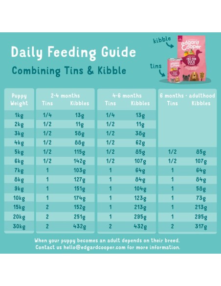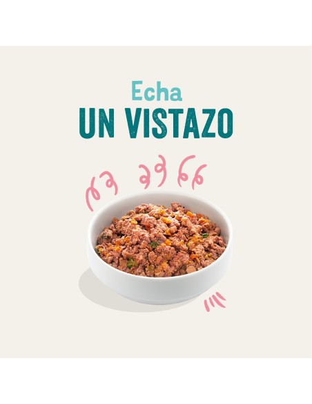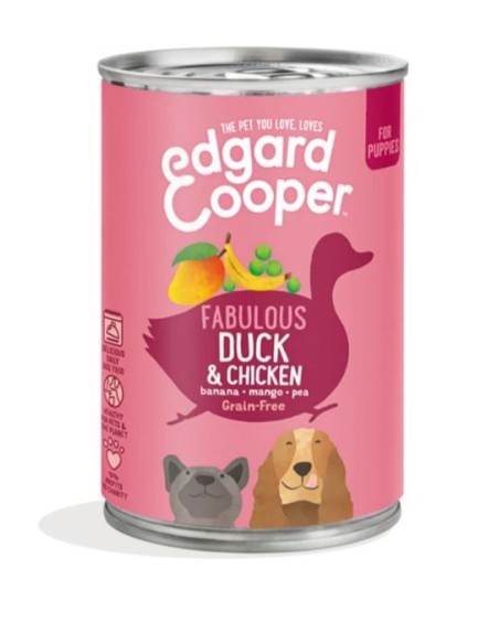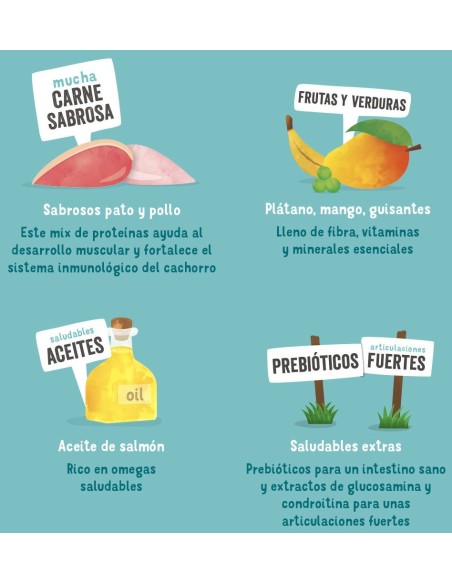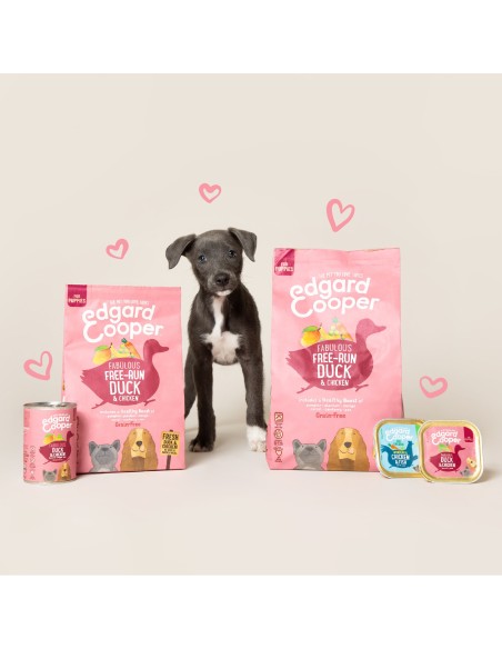 Repleta de sabroso pato y pollo, esta receta sin cereales está especialmente diseñada para satisfacer las necesidades nutricionales de un cachorro en crecimiento. Está repleta de suculentas proteínas, que ayudan a la formación de los músculos y favorecen el buen funcionamiento del organismo. La receta contiene prebióticos para un intestino sano y añadimos extractos de glucosamina y condroitina para fortalecer las articulaciones. Además, añadimos a la carne algunos complementos nutritivos (como el corazón y el hígado) para obtener una dosis extra de nutrición. Combinamos nuestras recetas con una mezcla súper saludable de frutas y verduras, además de un refuerzo extra de hierbas y productos botánicos nutritivos. A continuación, lo cocinamos al vapor para conservar todo el sabor y sus propiedades.