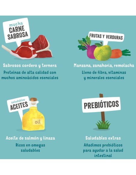 Esta receta sin cereales contiene mucha carne de cordero y de vaca, lo que proporciona una gran fuente de proteínas de alta calidad y aminoácidos esenciales. También contiene prebióticos para mantener un intestino saludable. Además, combinamos la carne con complementos nutritivos (como el corazón y el hígado) para un aporte extra de nutrición. Elaboramos nuestras recetas con una mezcla súper saludable de frutas y verduras, además de un toque extra de hierbas y productos botánicos nutritivos. Luego las cocinamos lentamente para mantener su pureza y su sabor.