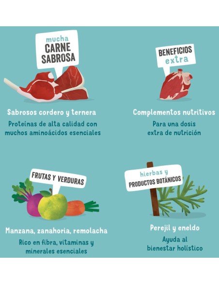 Cordero 30%, vacuno 26%, minerales, zanahorias 2%, brécol 1%, remolacha 1%, manzanas 1%, espinacas 1%, perejil 0,1%, eneldo 0,1%.