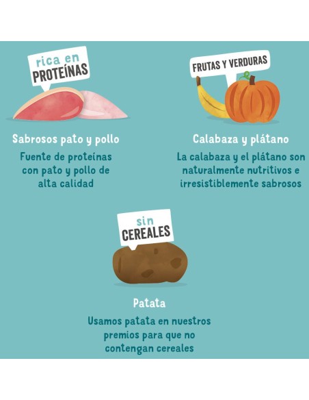 Ingredientes: Pollo (70%), pato (14,8%), patata (7%), glicerol procedente del aceite de colza (4,75%), minerales, calabaza (1%), plátano (1%).