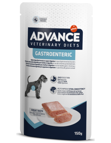 ADVANCE VETERINARY DIETS GASTROENTERIC es un alimento dietético completo y equilibrado para cachorros mayores de 14 semanas y perros adultos, elaborado con ingredientes muy digestibles, nivel bajo de fibra y un mayor contenido de sodio y potasio, para ayudar a reducir ciertas alteraciones gastrointestinales y para casos de insuficiencia pancreática exocrina.