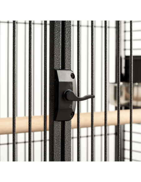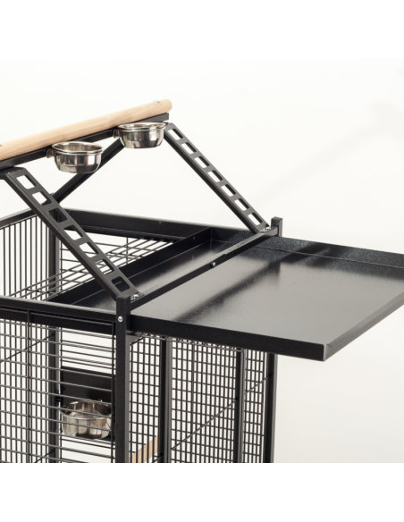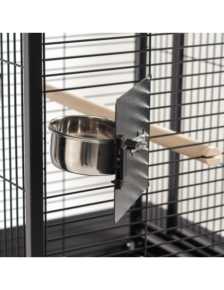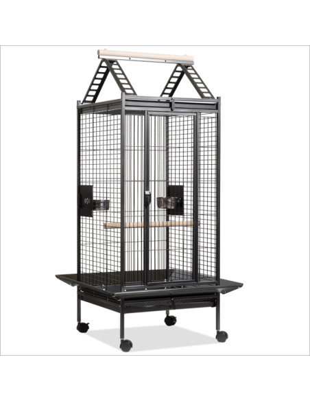 Esta jaula está fabricada en metal grueso, material de calidad, resistente y muy duradero. Incorpora dos bandejas metalizadas extraíbles, una para la zona de descanso superior externa y otra en la parte inferior de la jaula que facilita la limpieza. Tiene una gran puerta frontal que facilita el acceso a la jaula y manejo del animal. En la zona superior tu pájaro podrá divertirse y disfrutar de unas excelentes vistas desde encima de la jaula. La zona inferior de la jaula tiene unas pletinas metálicas inclinadas que recogen la suciedad y evitan que se dispersen alrededor de la jaula. Está equipada con ruedas para facilitar el desplazamiento. Es muy fácil de limpiar y desinfectar. Incluye 4 comedero (2 tamaño pequeño y 2 tamaño mediano) de acero inoxidable y 2 palos agarraderos de madera.