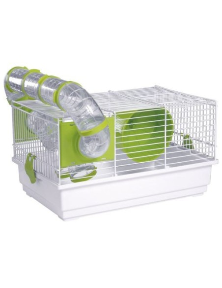 La jaula está fabricada en metal con los barrotes en sentido horizontal pintados de color blanco con apoxi libre de plomo. Los accesorios son de plástico polipropileno. La jaula tiene los barrotes en sentido horizontal. Los túneles de plástico transparentes permiten ver todo lo que hace el animal dentro sin molestarlo. La cubeta inferior tiene bordes altos que evitan que el lecho se derrame. Tiene una puerta superior para facilitar el acceso a la jaula y su limpieza. Gracias a su diseño garantiza una perfecta ventilación y circulación del aire. Es muy fácil de lavar y puede desinfectarse periódicamente.