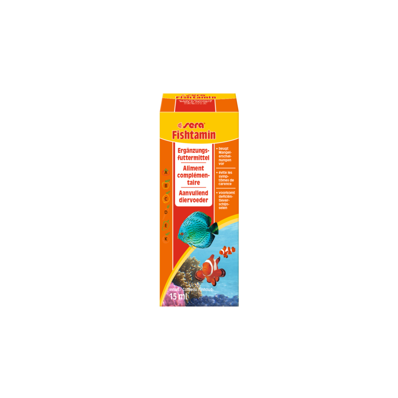 - Para el fortalecimiento en situaciones de estrés (p. ej. traslado, medidas de cuidado, luchas territoriales, oscilaciones de temperatura) así como en el caso de enfermedades, aplicar a diario 2 3 gotas en el alimento. En caso de peces que ya no comen, añadir 6 7 gotas por cada 50 l de agua de acuario. Atención: puesto que las vitaminas son sensibles a la luz, la adición directa de Fishtamin en el agua de acuario no se debería llevar a cabo hasta el anochecer, tras haber apagado la iluminación.