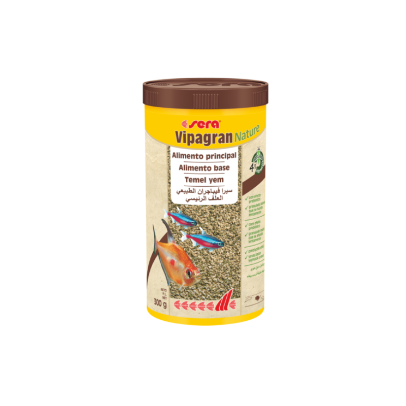Sera Vipagran Nature es un alimento principal en forma de granulado blando elaborado conservando todas sus propiedades, sin colorantes ni conservantes, para todos los peces que comen en las zonas intermedias del agua.